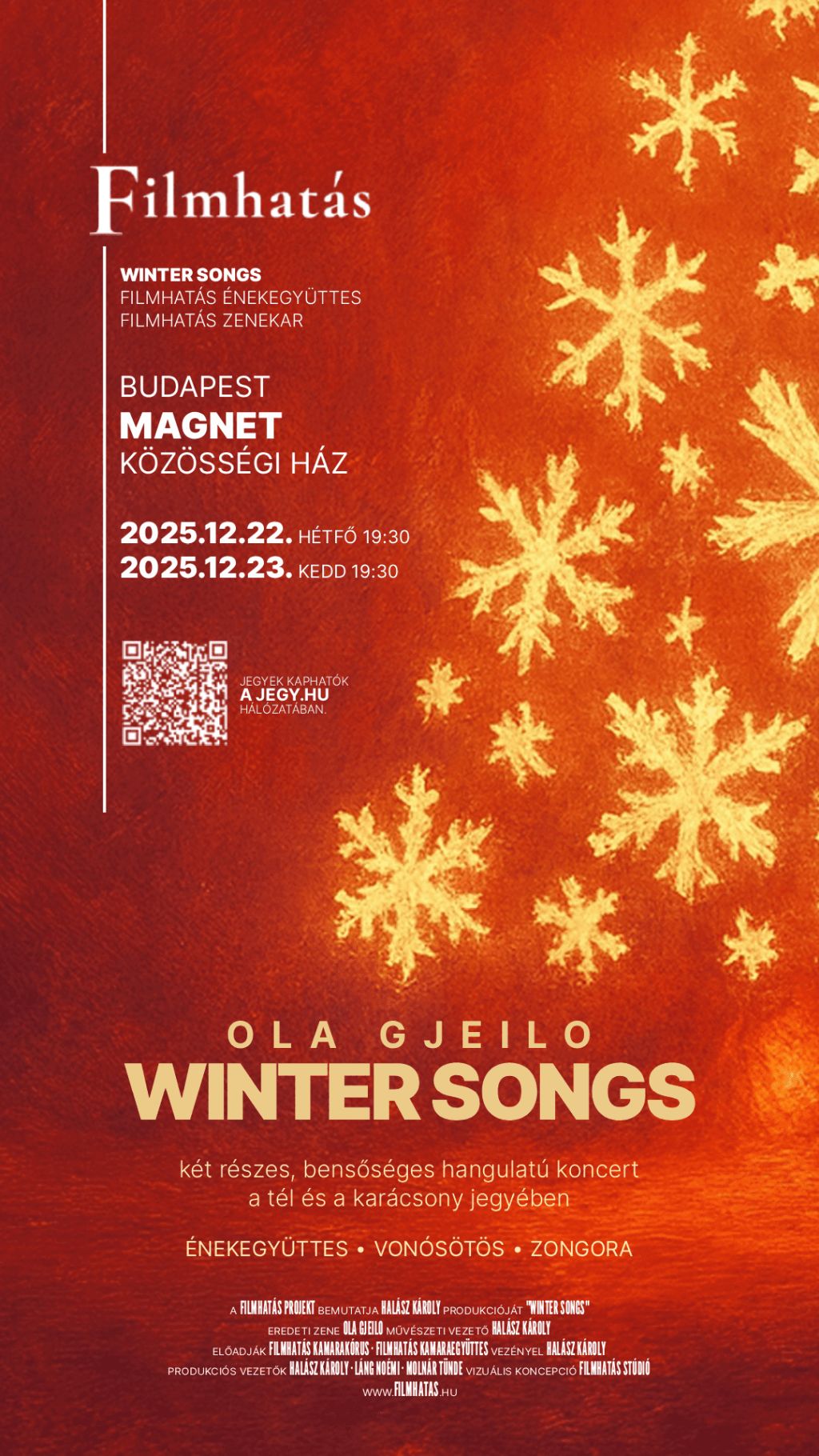 Az elmúlt évadokban nagy sikerrel bemutatott Winter Songs ismét színpadra kerül a Filmhatás Projekt és a megújult Filmhatás Kamarakórus előadásában.